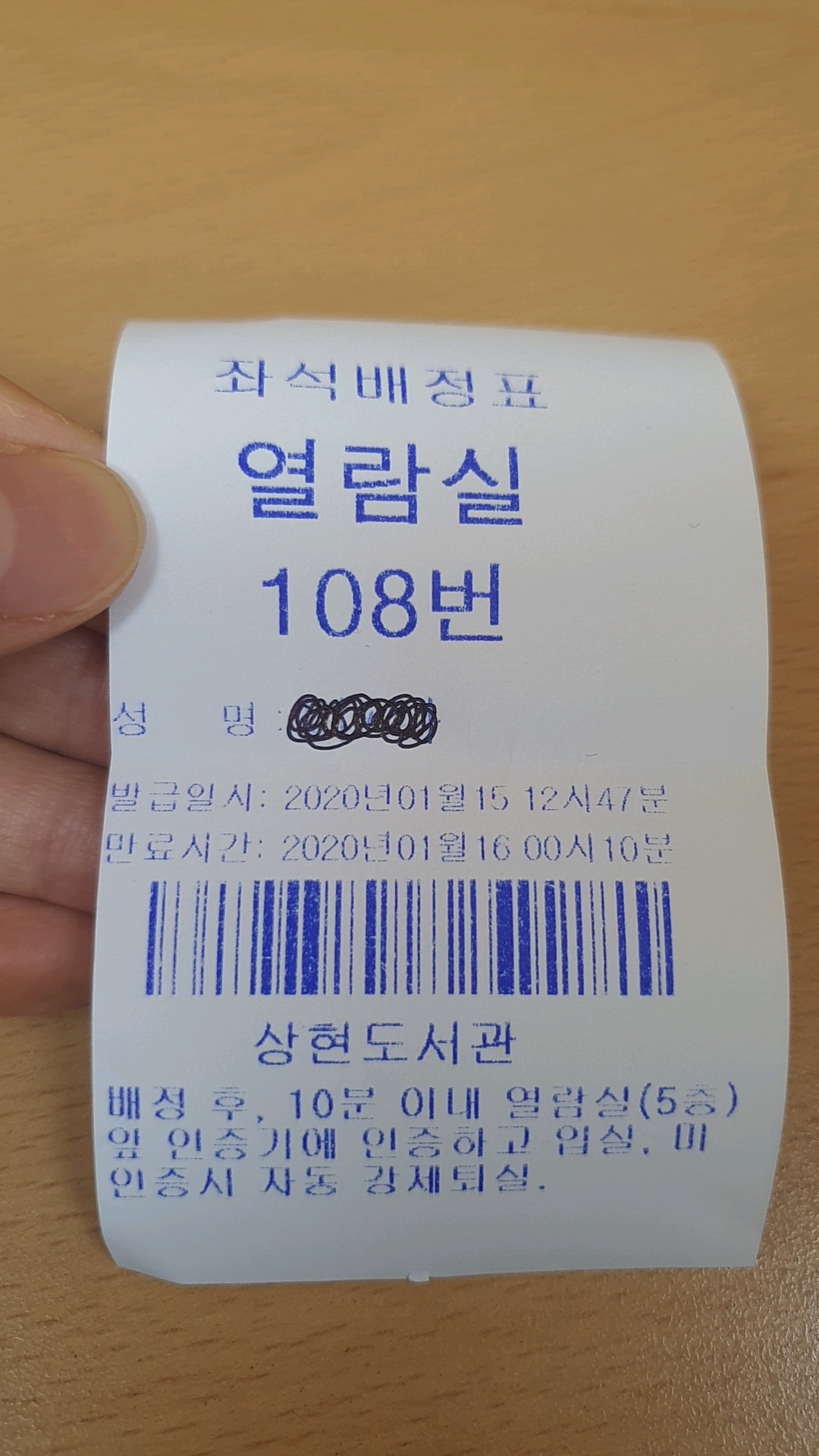 열람실에 들어가기 전에 10분 안에 꼭 회원증이나 발급 받은 바코드를 인식시켜주어야 합니다
