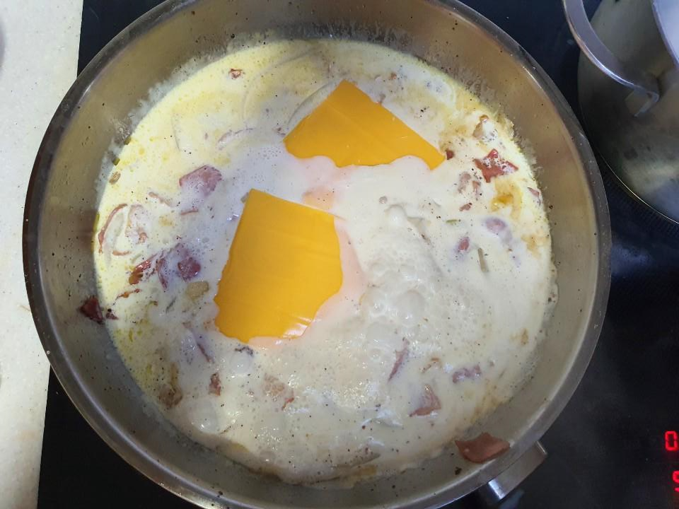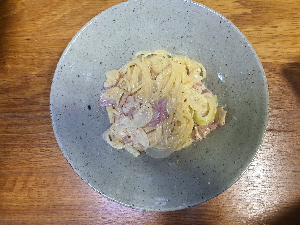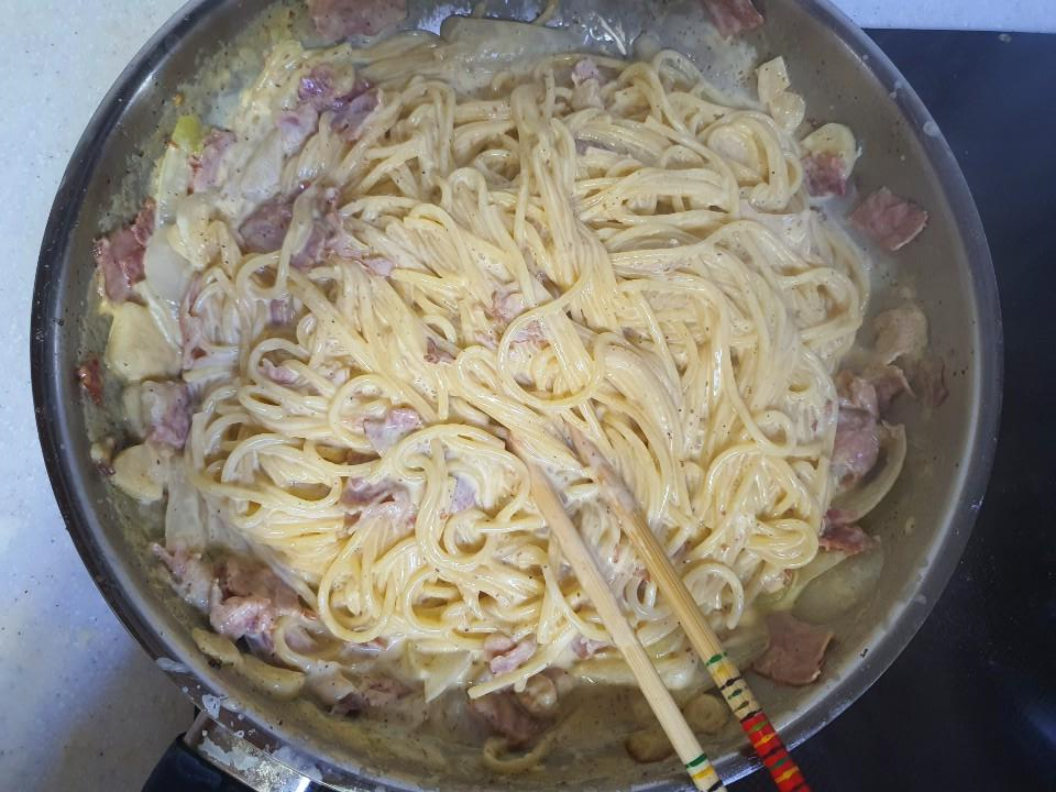 우유, 휘핑크림, (체다) 치즈, 스파게티 면, 양파, 베이컨, 후추, 소금