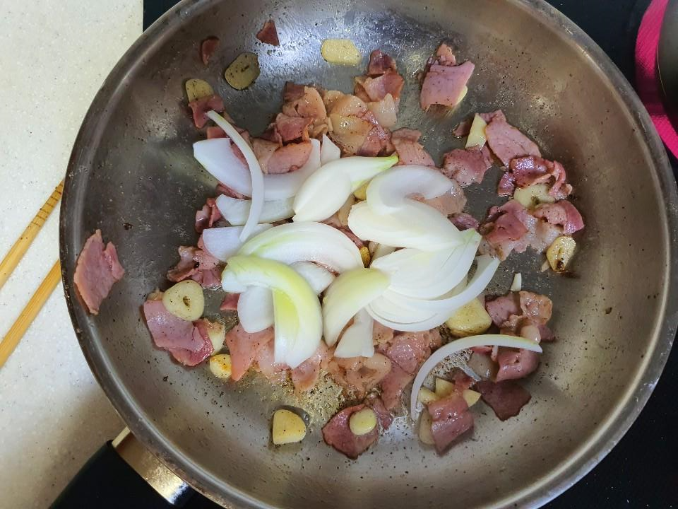 파스타 면을 삶는 동안 베이컨과 마늘, 양파를 볶아줄게요