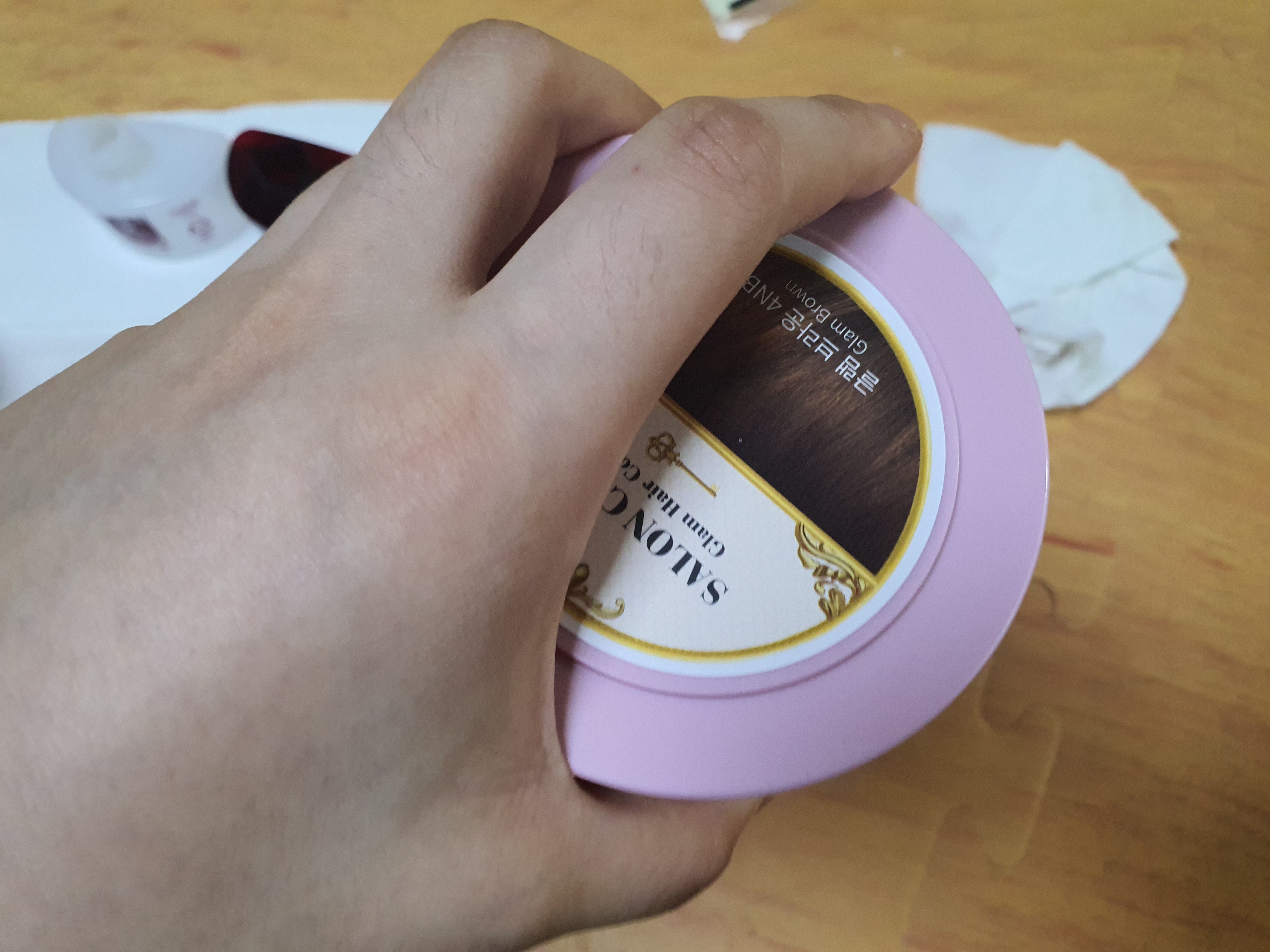 염색약이 분홍색 통에 1제 2제 반반씩 들어있고 비닐로 된 귀마개, 손장갑, 튜뷰형으로 된 머릿결 좋아지는? 게 함께 들어있습니다