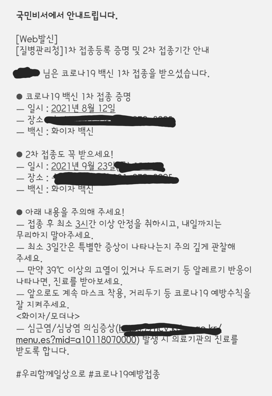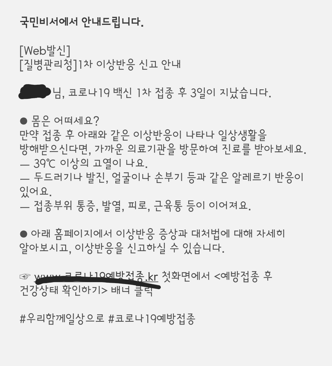 이 문자는 백신 1차를 맞고 3일 차가 되면 오면 문자입니다!