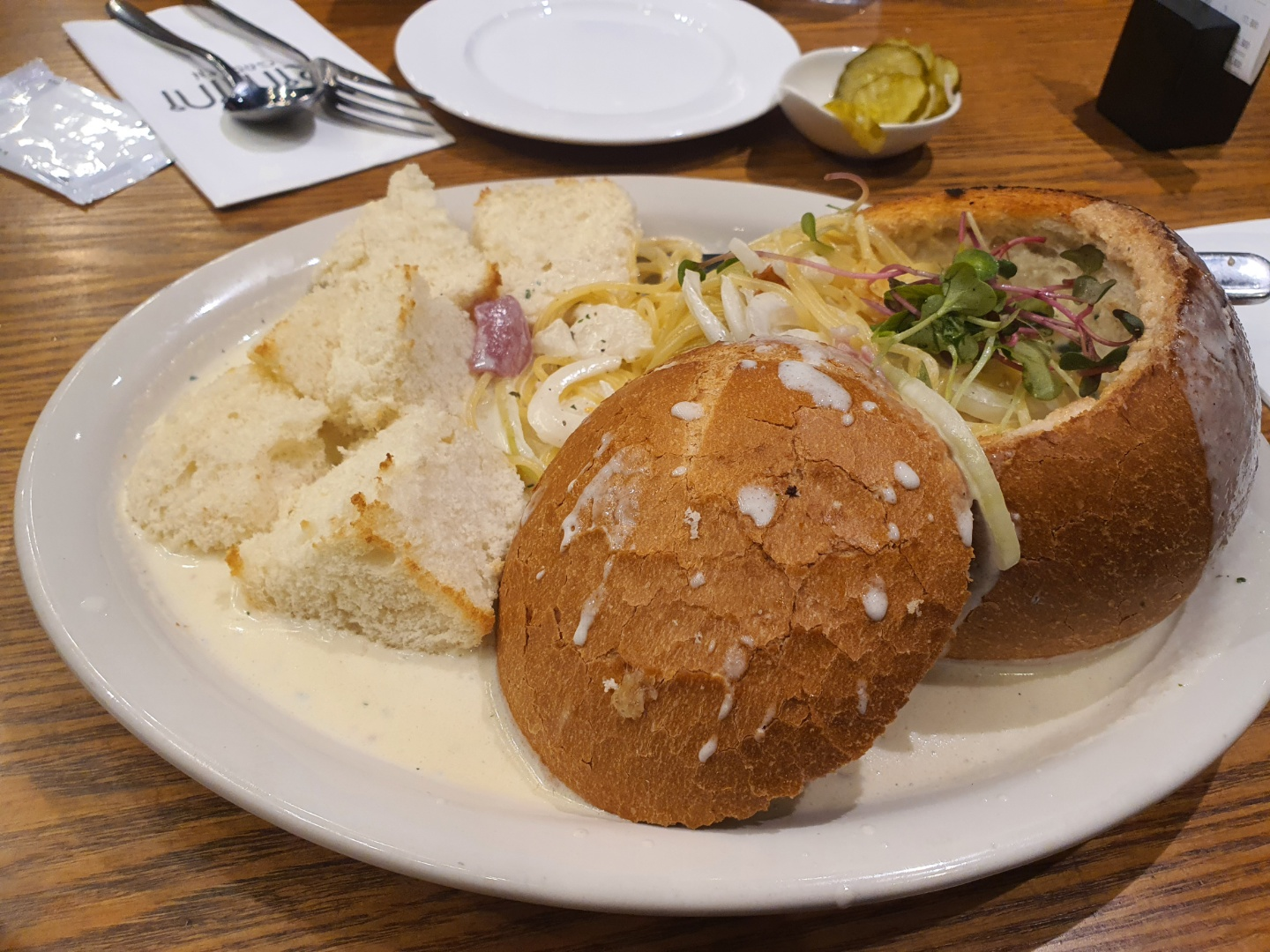 우선 파스타가 나오면 무조건 저 네모난 속 빵을 크림에 듬뿍 찍어서 먹어보세요!