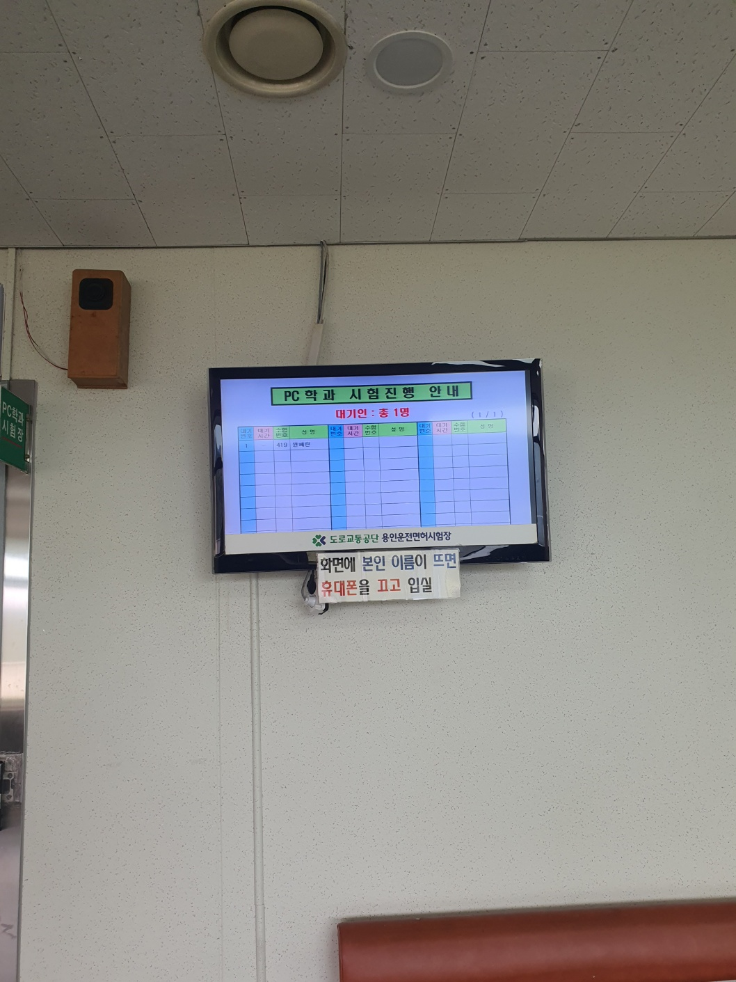 필기시험 응시까지 완료하였으면 바로 시험을 보게 됩니다. 안전교육을 들었던 2층으로 다시 올라가시면 됩니다. 아래 사진에 있는 PC학과 시험진행 안내 모니터에 자신의 이름이 뜨면 학과시험장에 입실하면 됩니다. 따로 시험장 밖에서 안내해 주시는 분이 없어서 그냥 이름이 뜨면 들어가시면 됩니다.