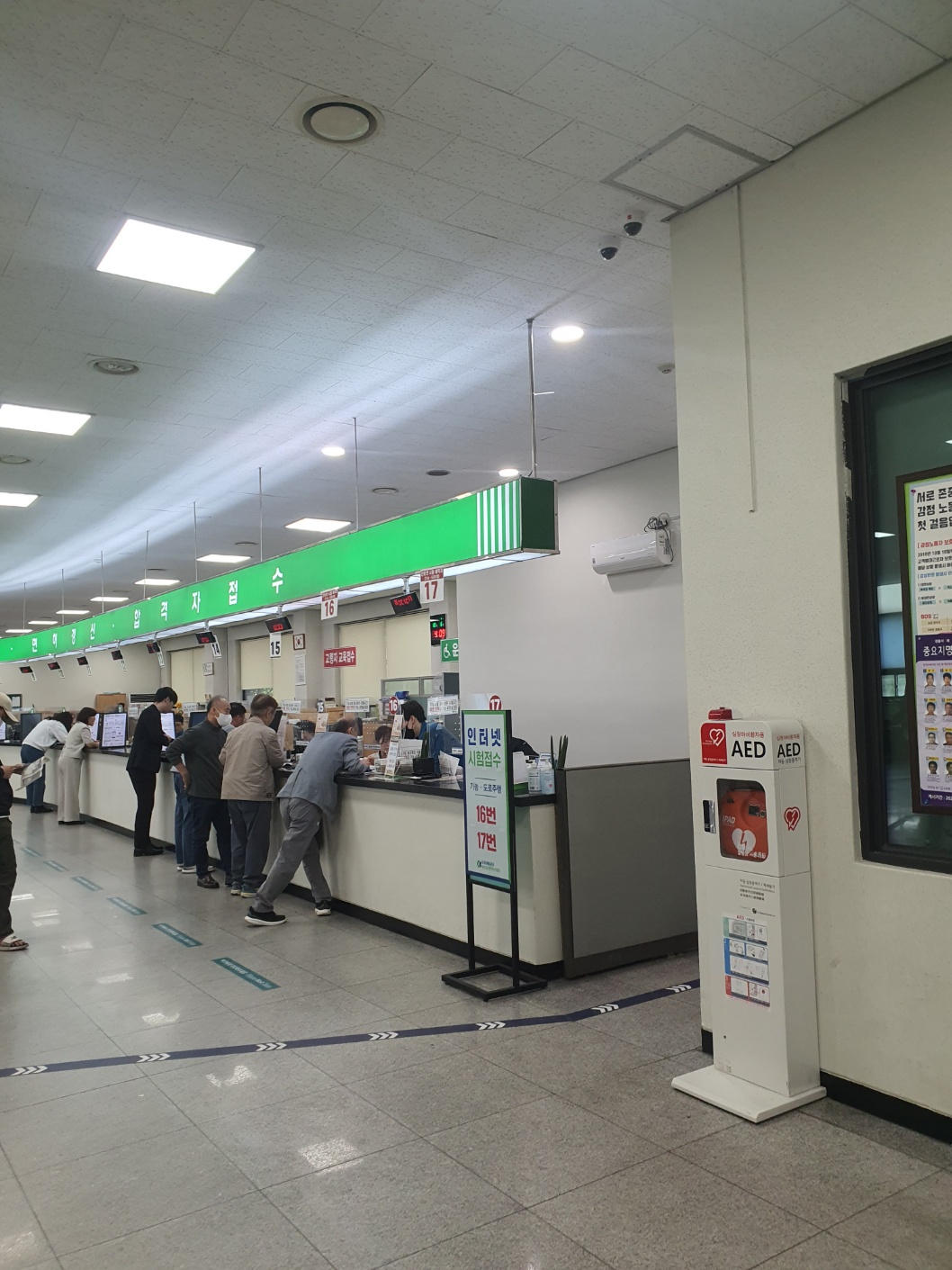이제 신체검사까지 무사히 마치셨다면 응시원서를 들고 다시 본관(A동) 1층에 가셔서 PC학과시험(=필기시험)을 접수하시면 됩니다. 이때 접수할 때는 번호표를 뽑으셔야 합니다. 번호표는 응시원서 받았던 [안내] 창구 쪽에 있는 번호표 기계에서 뽑으시면 되고 아래 사진에서 보시는 곳처럼 맨 오른쪽 끝 2곳에서 학과시험 접수가 진행됩니다. 이때 준비해간 신분증, 필기시험 응시료가 필요합니다.